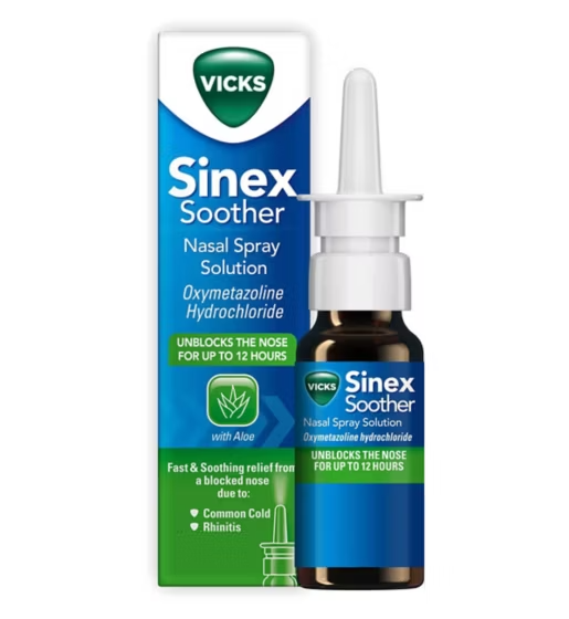 Fast-acting nasal spray for relief from blocked nose and sinus congestion. Vicks Sinex Soother contains oxymetazoline hydrochloride to quickly clear nasal passages and soothe irritation, helping you breathe easier during colds, flu, and allergies.